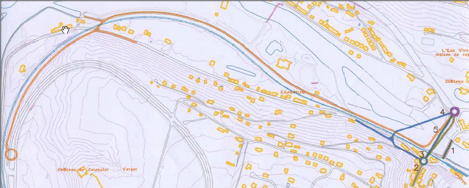 La suppression des deux passages à niveau de Sainval (PN 8) et Colonster (PN 7) , telle que décrite dans le projet 5 ci-dessous, pourrait aussi être réalisée dans le cadre du projet 1 (ou de tout autre projet). De fait, cette double suppression est un projet de la SNCB de longue date ; il implique une nouvelle voirie décrite sous le nom de voirie SNCB dans l'étude Agora (voir le côté gauche de la carte ci-dessous, la partie du tracé en rouge comprise entre la rue d'Angeur et le bas du boulevard de Colonster - tranchée de Saint-Val entre les 2 passages à niveau où passe le chemin de fer). Ce projet implique le percement de la paroi rocheuse au Sud de la tranchée de Saint-Val et la construction d'un pont.